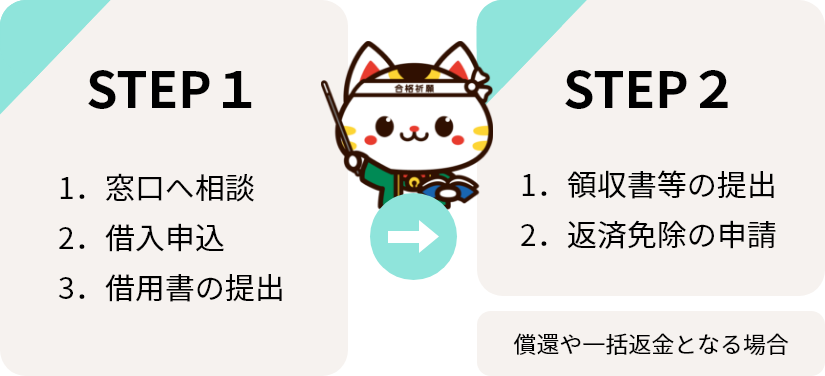 - 領収書等の確認ができない場合、貸付金全額を一括返金いただきます。